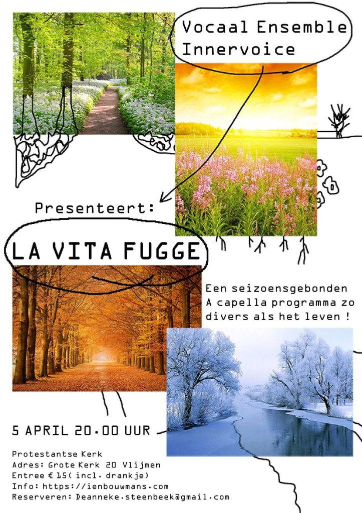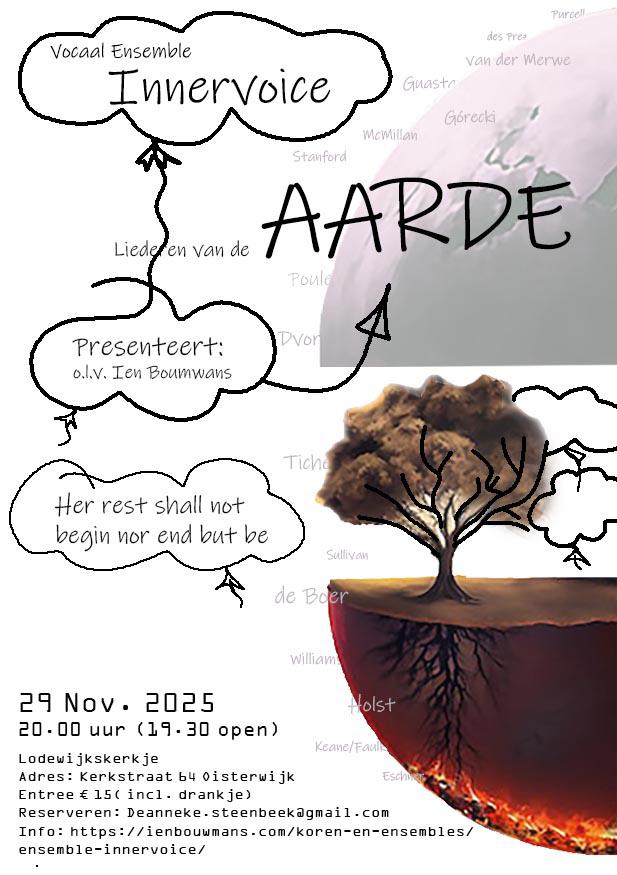 Op zaterdag 29 november geeft Vocaal Ensemble Innervoice in het Lodewijkskerkje te Oisterwijk, een a capella concert met prachtige liederen over de Aarde. De natuur, de elementen maar ook de kwetsbaarheid van de mens en onze wereld wordt in verschillende toonaarden en talen bezongen. Muziek als universele wereldtaal. Van harte welkom! Aanvang 20:00 uur Reserveren kan via deanneke.steenbeek@gmail.com Meer info:… Lees verder →