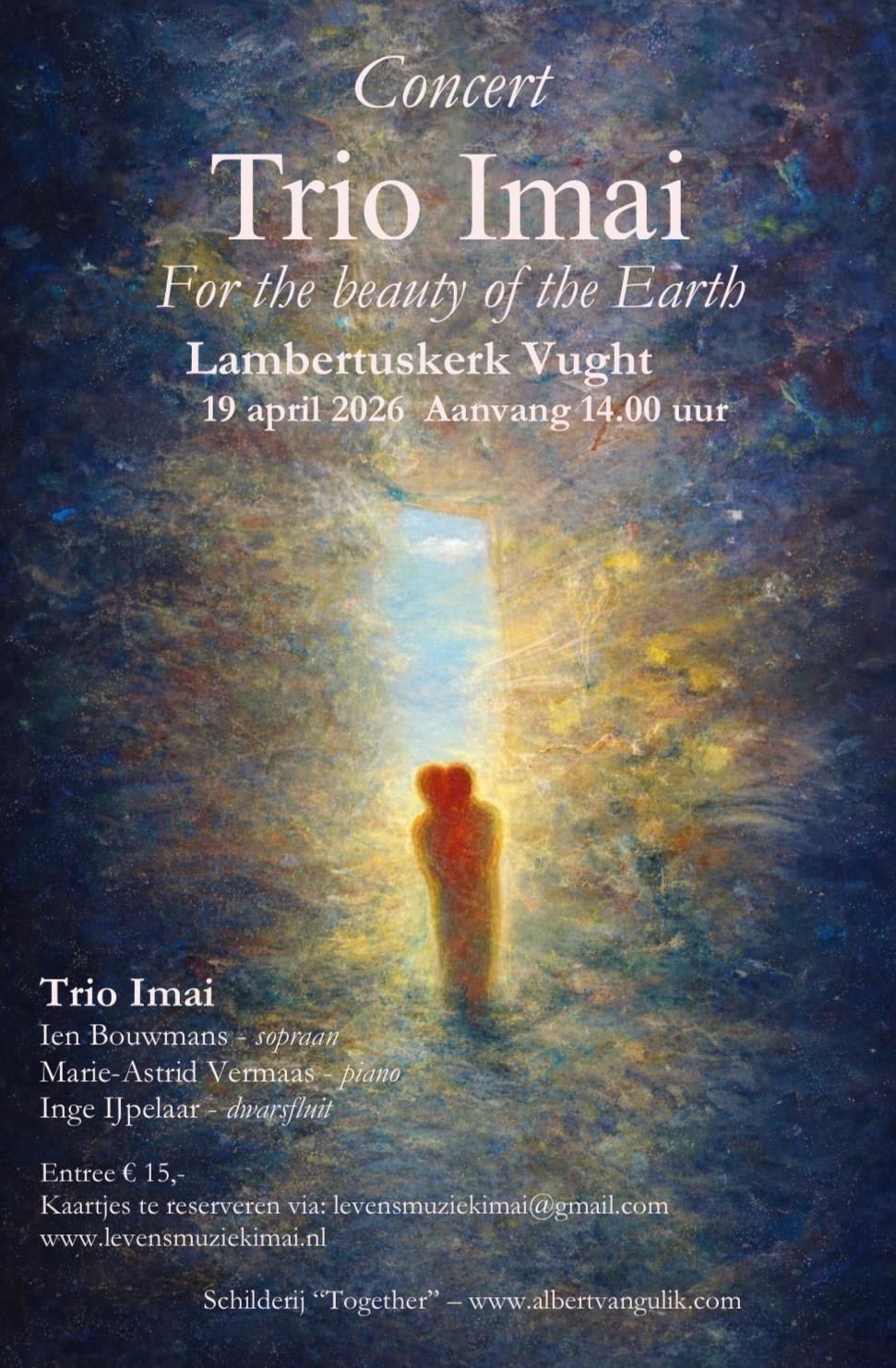 Op zondag 19 april verzorgt trio IMAI het Concert “For the Beauty of the Earth” in de Lambertuskerk te Vught aanvang 14:00 uur. Inge IJpelaar, fluit, Marie-Astrid Vermaas, piano, Ien Bouwmans, sopraan Reserveren: levensmuziekimai@gmail.com Toegang € 15,- Tijdens dit concert brengen we een muzikale ode aan moeder Aarde. In deze turbulente tijd verlangen we naar schoonheid en zingeving. Daarom staat op dit gevarieerde programma de ongekende pracht van de natuur centraal. Zo vinden we er in de muziek en in de teksten de 4 elementen Aarde, Lucht, Water en Vuur. Het kleurrijke leven op deze wereld laten we dankbaar horen: vloeiend als water, dwarrelend als bloemblaadjes, vlammend als de zonsondergang en rustgevend als de blauwe lucht. Een warm welkom!