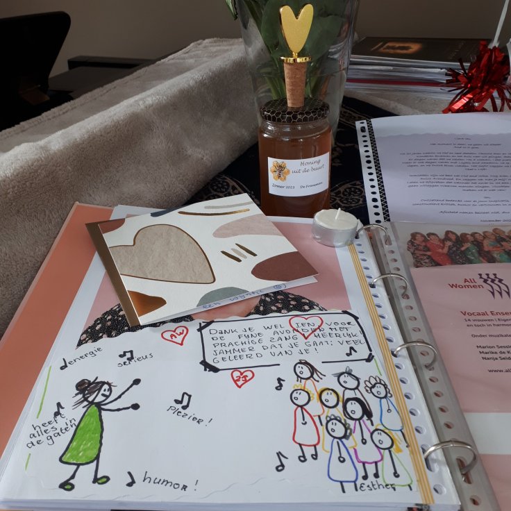 En dan zit het er op. Na 20 mooie muzikale jaren waarin we lief en leed deelden, de stemmen en koorklank zich ontwikkelden naar steeds hoger niveau, we vele afwisselende programma’s en muzikale theatervoorstellingen hebben gemaakt, kan ik met trots en een gerust hart mijn dirigeerstokje overdragen. Ook het 25-jarig jubileumconcert “Uit het hart” van 4 november j.l., was een succesvolle afsluiting. Tijdens de laatste repetitie werd ik flink in het zonnetje gezet met cadeaus, fotoboek met herinneringen en een lied. Ook een afscheidslied van mijn kant en een laatste toost op de toekomst. All Women bedankt!!